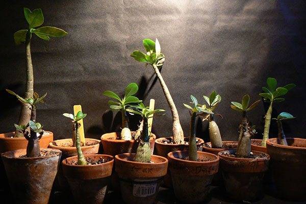 Солнечного света адениуму всегда будет мало. У себя на родине он не испытывает недостатка в освещении, поэтому вырастает до впечатляющих размеров. При обустройстве места для дерева необходимо ориентироваться на высокий уровень проникновения солнечных лучей. Исключения существуют для растений из магазина и молодых саженцев. Недавно купленное растение требует адаптации – его стоит приучать к яркому свету постепенно. А неокрепшие ростки могут обгореть под прямыми солнечными лучами. Горшки с ними следует регулярно поворачивать.