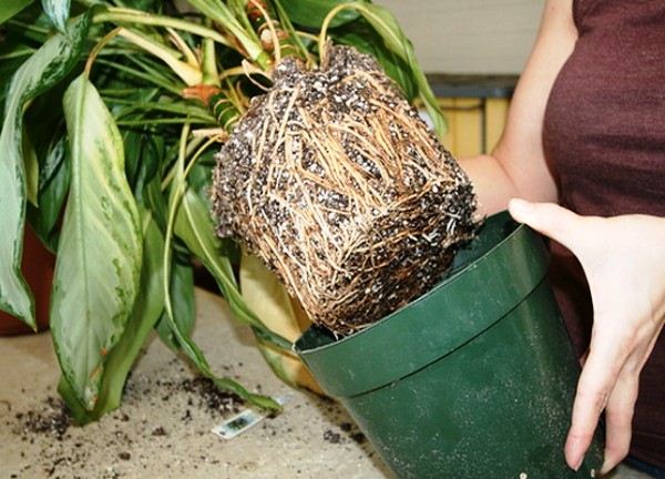 - если грунт старый, обедненный микроэлементами, то лучше его полностью удалить с корней струей теплой воды;