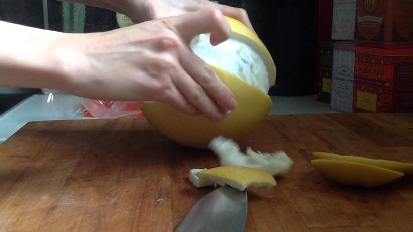 - В верхней части памелы должно образоваться небольшое углубление. Просуньте в него большие пальца обеих рук и осторожно потяните их в разные стороны. Продолжайте тянуть, пока цитрус не распадётся на две равные части.