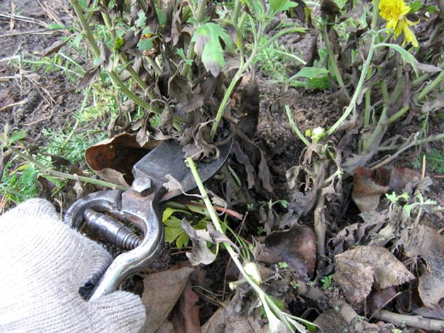 Обрезка хризантем перед выкапыванием для хранения.