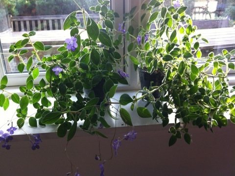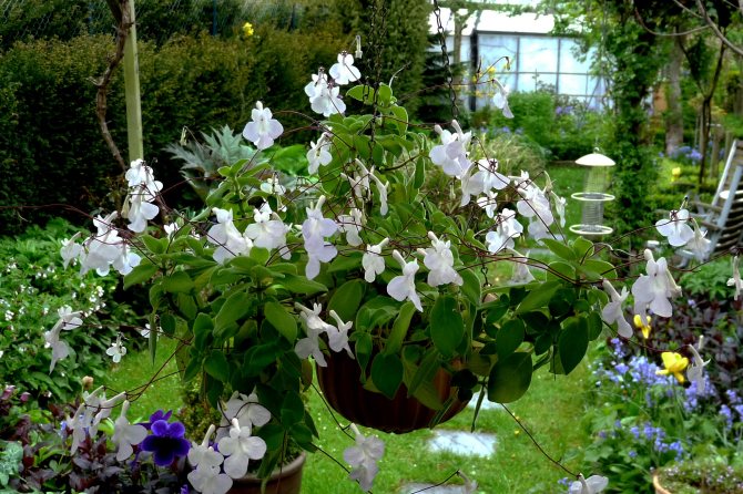 Они появляются из листовых пазух вдоль всего стебля, вырастают длинные до 8 см тонкие и упругие, как проволочки, на концах которых располагаются несколько нежных трубчатых мелких цветов (2 – 3 см), напоминающих фиалку. Лепестки – лилового оттенка, трубка – белоснежная. Цветет растение длительно и пышно, несмотря на быстрое опадание венчиков (3 – 5 дней), выпуская все новые и новые цветоносы.
