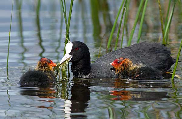 Великие хохлатые гребы ловят рыбу на своих погружениях красными клювами. Весной характерные ритуалы ухаживания — захватывающее событие. Молодые птицы громко умоляют своих родителей и иногда плавают, контактируя с спиной матери. Два представителя семьи Раллен чаще встречаются в наших водах: Пут и Мурхен. Кошка — черная круглая водяная птица. Удивительными и отличительными являются красные глаза, белая лицевая пластина и белый клюв. В размножном сезоне койты — это не только призывные, но и очень территориальные, и каждый соперник соперничает с угрожающими крыльями и головой, опущенной на поверхность воды в барьерах.