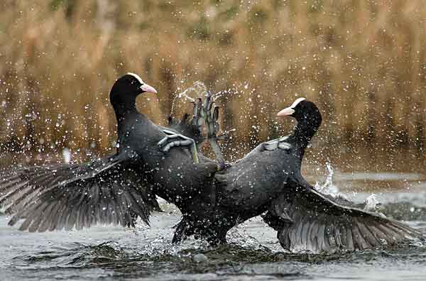 При тесном гнездовании драки бывают массовыми, с участием 3-4 пар одновременно. Самка лысухи всегда поддержит своего селезня в драке.