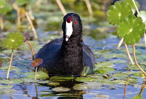 Общий цвет оперения у лысух насыщенный черный, на животе и груди перья немного светлее, подхвостье белое. На лбу – небольшой оголенный участок кожи белого цвета (из-за него птица и получила название). Клюв птицы также белого цвета.