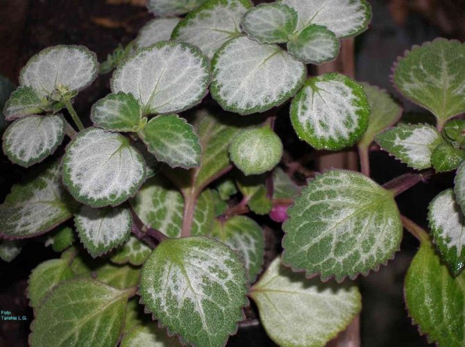Этот вид относится к гибридам. Прямостоячий куст с коричневато-бурыми побегами и яйцевидной листвой с зубчатой кромкой. Листик с лицевой стороны имеет темно-зеленый цвет и глянцевый блеск. С внутренней стороны он пушистый с фиолетовым оттенком.