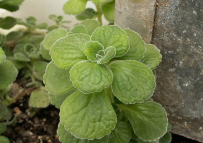 Растение с мясистыми побегами и темно-зелеными листками. Кромка пильчатая. Форма листвы напоминает дубовые, правда в нем присутствует серебристый пушок. Несмотря на то, что другие виды больше пахнут мятой, этот обладает резким хвойным оттенком.
