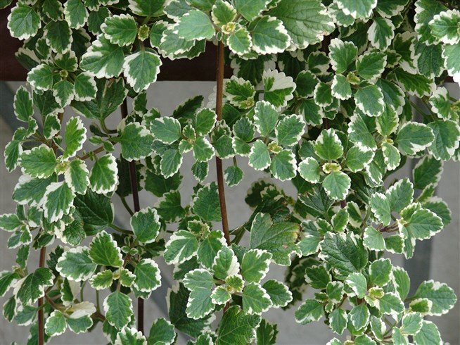 Самое неприхотливое растение. Имеет несколько названий: плектрантус монетчатый, шведский плющ, плектрантус мутовчатый. Стебли склоняются вниз, а на них располагаются листья с длинными черешками, большие и глянцевые с двух сторон. Источает очень слабый аромат.