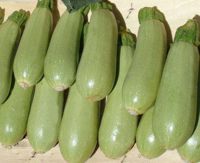 Особенность этого гибрида в том, что он может завязывать плоды даже в условиях низких температур. Они имеют форму цилиндра или булавы, кожица покрыта восковым налетом и окрашена в светло-зеленый цвет, имеет светлый крап и прожилки. Длина одного кабачка невелика – всего 18-20 см, а масса каждого плода варьируется в пределах 400-700 г (частый сбор стимулирует плодоношение).