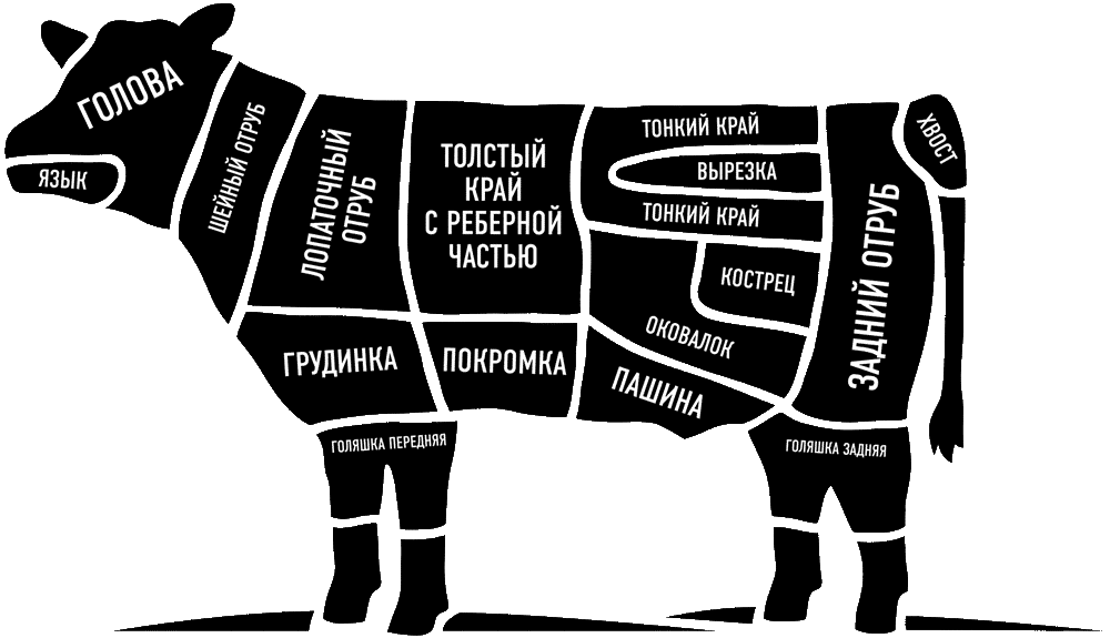 В России принята своя собственная схема разделки говяжьей туши (кстати не сильно отличающаяся от приведенных выше) и своя терминология, которую будет полезно узнать всем заядлым мясоедам: 1-2. Шея (верхняя и нижняя часть) — это мясо относят ко второму сорту, его лучше покупать в виде фарша. Нижняя часть шеи раньше называлась гривенкой, а верхняя зарезом. 3. Лопатка — это мясо относят к первому сорту, оно вполне подходит для тушения (гуляш, рагу) и жарки, но требует долгого приготовления. 4-5. Реберная часть (толстый край) — первосортное мясо, в цельном виде состоит из 13 ребер: первые 3 присоединены к нижней части лопатки, их удаляют; следующие 4 ребра обычно продают целым куском, который готовят как мясо на косточках, но кости можно срезать и приготовить мясо в виде рулета; на последующих 3 ребрах содержится больше мяса; остальные ребра — это довольно дорогой срез нежного мяса. 6. Филейная часть (тонкий край, ростбиф) — первосортный срез нежного мяса, которое можно жарить и готовить в гриле; в середине этой части располагается вырезка (филей). 7. Кострец — первосортное постное мясо для жарки и гриля. 8. Окорок (огузок, бедро) — первосортное мясо, постный срез, который хорошо подходит и для тушения в горшочке, и для бифштекса с кровью; эту часть туши можно засаливать, тушить или жарить. Самая ближняя к хвосту часть называется «горбушка» и идет на жаркое. 9. Голяшка — постная говядина третьего сорта, предназначенная для тушения (название относится только к задней ноге) или для варки бульона. 10-11. Бочок (пашина) — довольно дешевое мясо второго сорта, используется для рагу или тушения. 12. Верхняя реберная часть (покромка) — постное мясо; его освобождают от костей, сворачивают в рулет и используют, например, для тушения в горшочке. 13. Грудинка — первосортное мясо; продается без костей в виде рулета и годится для отваривания, тушения, супов (например, на рассольник), в рагу и пловы. 14. Рулька — мясо третьего сорта, требует длительного приготовления (название относится только к передней ноге).