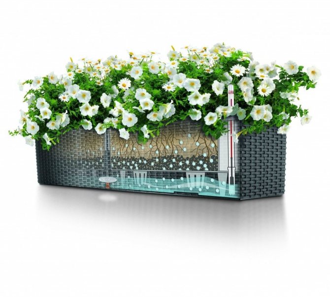 Изображение устройства балконного кашпо с автомотической системой полива. © lechuza