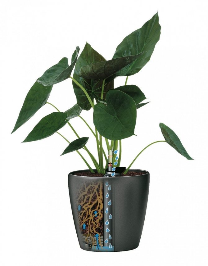 Насыщение субстрата влагой происходит на капиллярном уровне, вода поднимается в грунт из резервуара медленно и постепенно, а главное — равномерно. Из внутренней емкости вода проникает в субстрат по мере его подсыхания, в зависимости от того, какими темпами растение потребляют влагу.