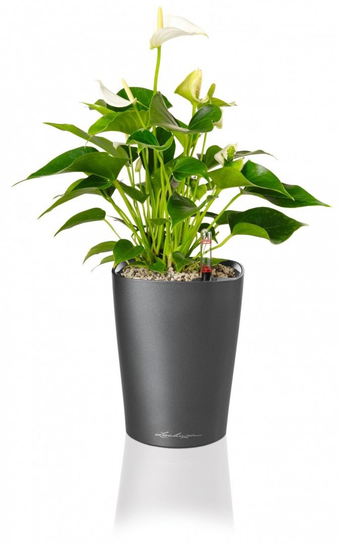 - Наличие индикатора уровня воды в поддоне, своевременно подскажет, когда надо полить растение, а когда слить лишнюю воду из поддона. Тем самым риск переувлажнения грунта, а, следовательно, загнивания корневой системы растения, минимальный. Пересыхание грунта, так же маловероятно. Как приготовить грунт для антуриума, читаем здесь.