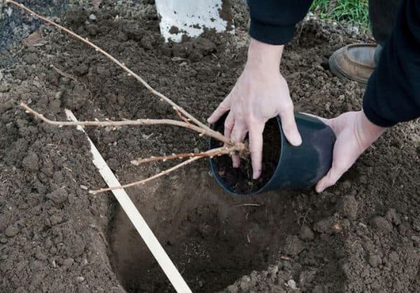 - Куст опускается в яму, при этом корневая линия (выглядит как отвердевшая полоса) была заглублена на пять — шесть сантиметров.