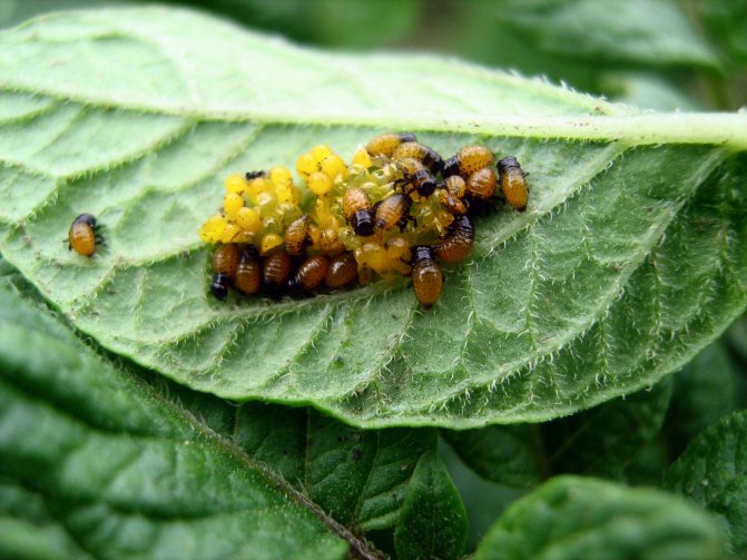 Из яиц личинки колорадского жука вылупляются примерно через 5-17 дней, точное число дней созревания зависит от погодных условий. У личинок небольшая черная голова и мясистое тело, снизу оно плоское, а сверху более выпуклое. На передней части тела есть три короткие пары ног черного цвета, по бокам в два ряда расположены черные бородавки.