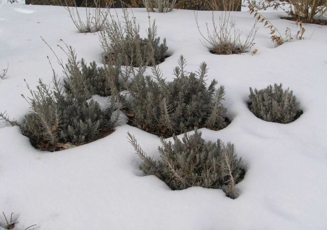 Перед зимовкой растения в полевых условиях следует организовать укрытие. При этом, по утверждениям экспертов, лаванда переносит мороз хорошо даже при кратковременной температуре в -25 °C. Если в регионе бывают длительные периоды с температурой около этой отметки или она вообще опускается ниже нее, то укрытие понадобится качественное. Не стоит забывать и о том, что зимы бывают дождливыми. От навеса лучше не отказываться. В конце переходного сезона кусты подрезают. На огороде кладут веточки хвойных деревьев — в качестве утепления. Листья не подойдут, ведь от этого в кусте лаванды могут начаться процессы гниения.