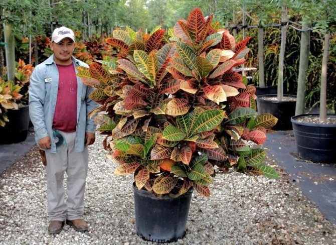 - размеры контейнера должны быть соизмеримы с объёмом корневой системы: если корням будет слишком тесно, то в первую очередь кротон начинает сбрасывать листья;