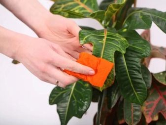 - Протирать лиственную часть влажной тряпочкой, салфеткой, губкой. Это позволит не только увлажнить сам кротон и воздух рядом с ним, но будет отличным средством борьбы с пылью, скапливающейся на листовых пластинах.