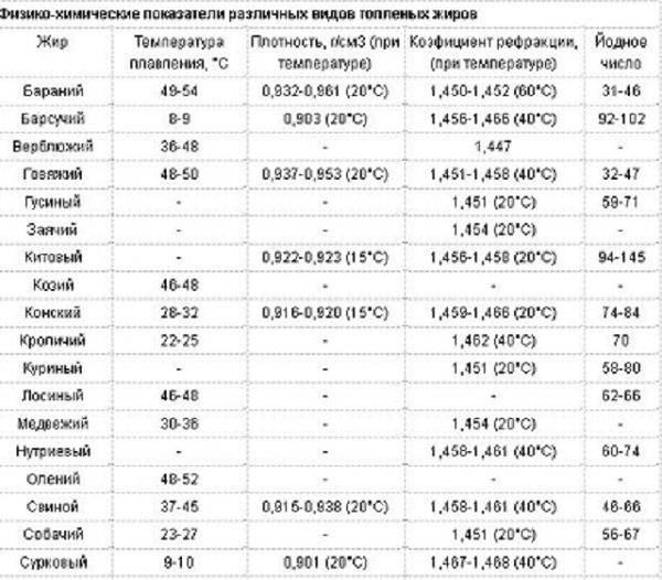 Коэффициент рефракции. Отклонение светового потока жира используют для лабораторного определения видовой принадлежности жира. Коэффициент преломления зависит от соотношения насыщенных и ненасыщенных жирных кислот. Соотношение близко у жира кролика (1,462) и сурка (1,467) при температуре 40 градусов Цельсия. У барсука аналогичные показатели чуть шире от 1.456 до 1,466 (40 градусов Цельсия). Коэффициент рефракции жира у других животных в пределах от 1,450 до 1,458.